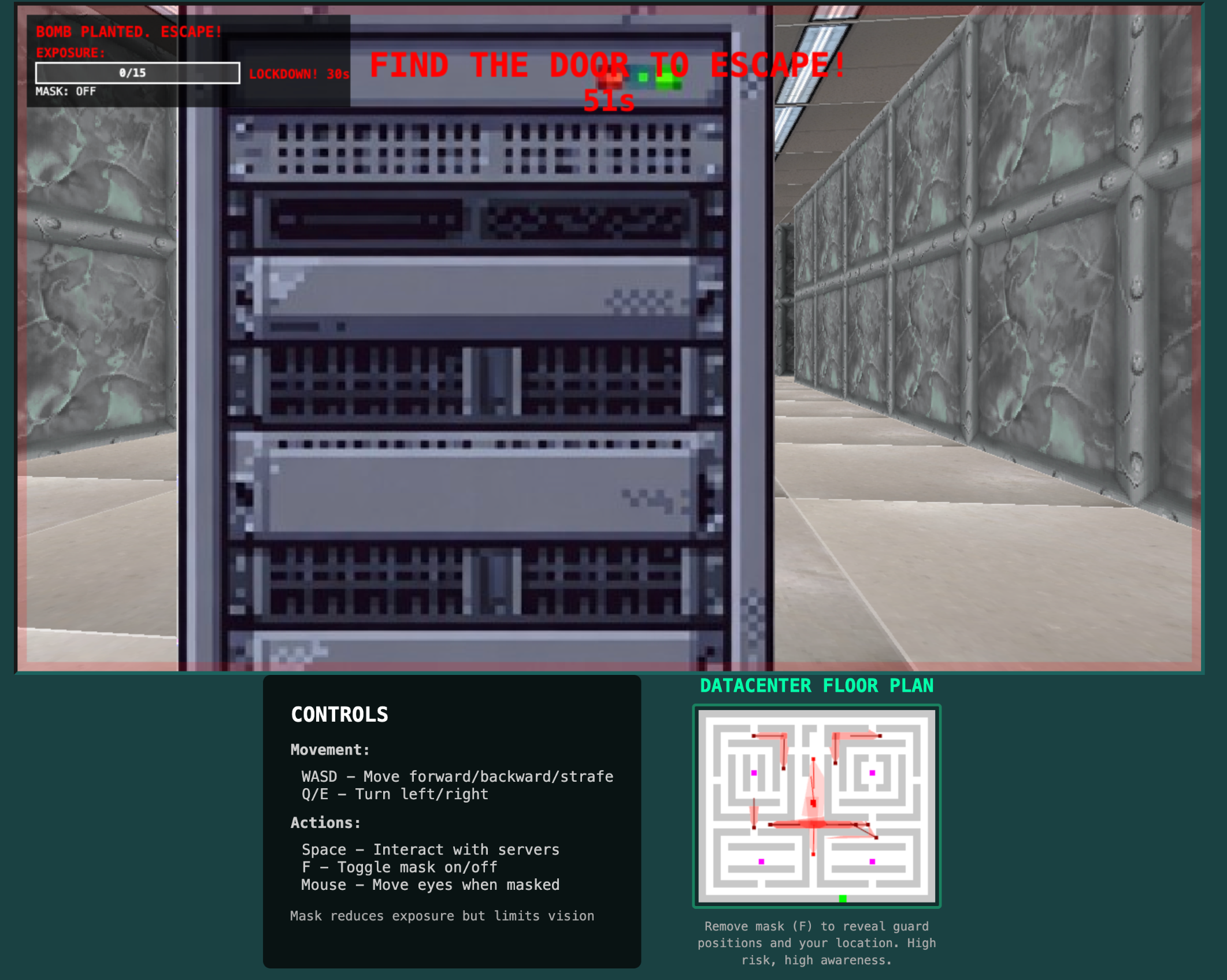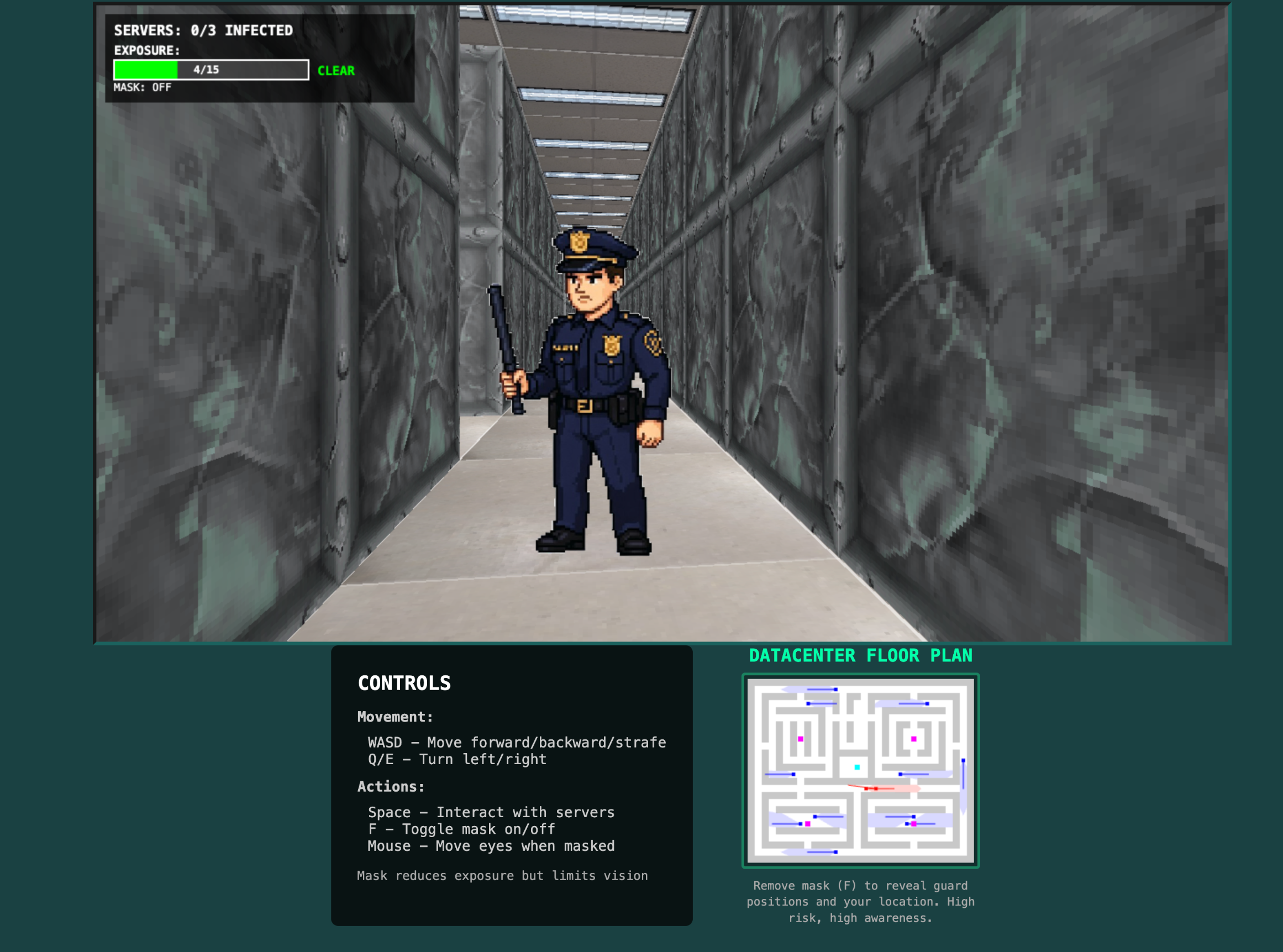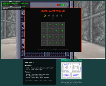 Your Mission: Infiltrate the high-security AI datacenter and hack three of the four satellite server terminals to gain access to the central AI mainframe. Once inside, plant a bomb and escape the facility before detonation. But there's a catch: you must keep your identity concealed with your trusty balaclava mask at all times.