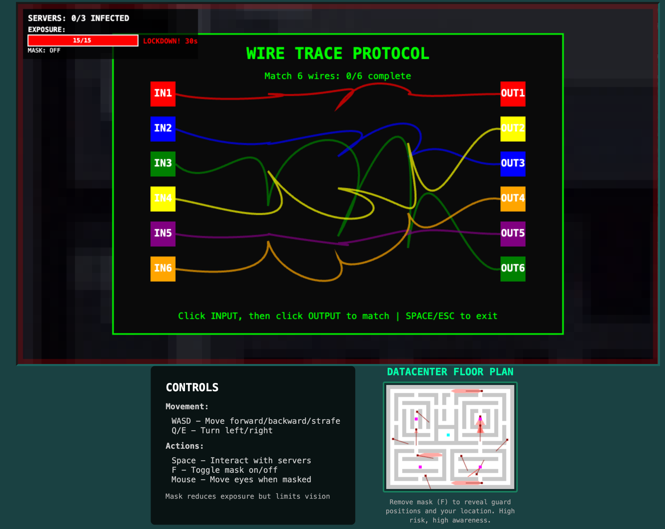 Love putting on the mask shiftily. Very hard game! I like how the colours of the wire matching minigame goes away when masked. Fun concept. Great work!